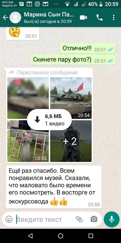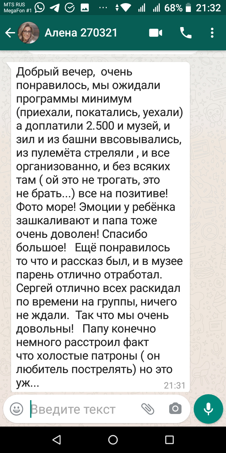 Мы уделяем огромное значение работе с обратной связью от клиентов и отзывы о КубинкаТур являются для нас очень важным аспектом работы нашей деятельности. Ваши отзывы необходимы нам для дальнейшего улучшения качества предоставляемых нами услуг, совершенствования навыков работы персонала и разработки новых увлекательных программ катания на танках и другой бронетехнике.